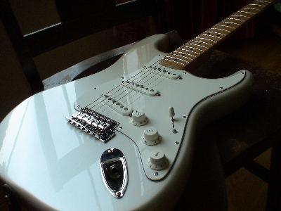 But on a whim, I thought I’d try some Strats – I can’t exactly explain why; perhaps there was just some uncertainty in me at the time… In any case, I’d never been a Strat guy, having always played with dual humbuckers, and preferring the rich, fat tone that humbuckers produce. But I thought I’d give a few Strats a try before I actually bought the DC. So I went to my favorite shop and played several Strats, from standards to custom shop models. Sure enough, while they sounded great, they just didn’t really do it for me. Then Jordan (the guitar dude at Gelb Music in Redwood City, CA) said, “Sounds like you want more of a vintage sound. I’ve got something here that you should check out. I love how this guitar sounds.” He then proceeded to pull down a white Strat. “Now this is a special edition, albeit Made in Mexico Strat,” said Jordan, “It’s a 60th Diamond Anniversary model, with vintage TexMex pickups, and I think this may have the sound you’re after.”