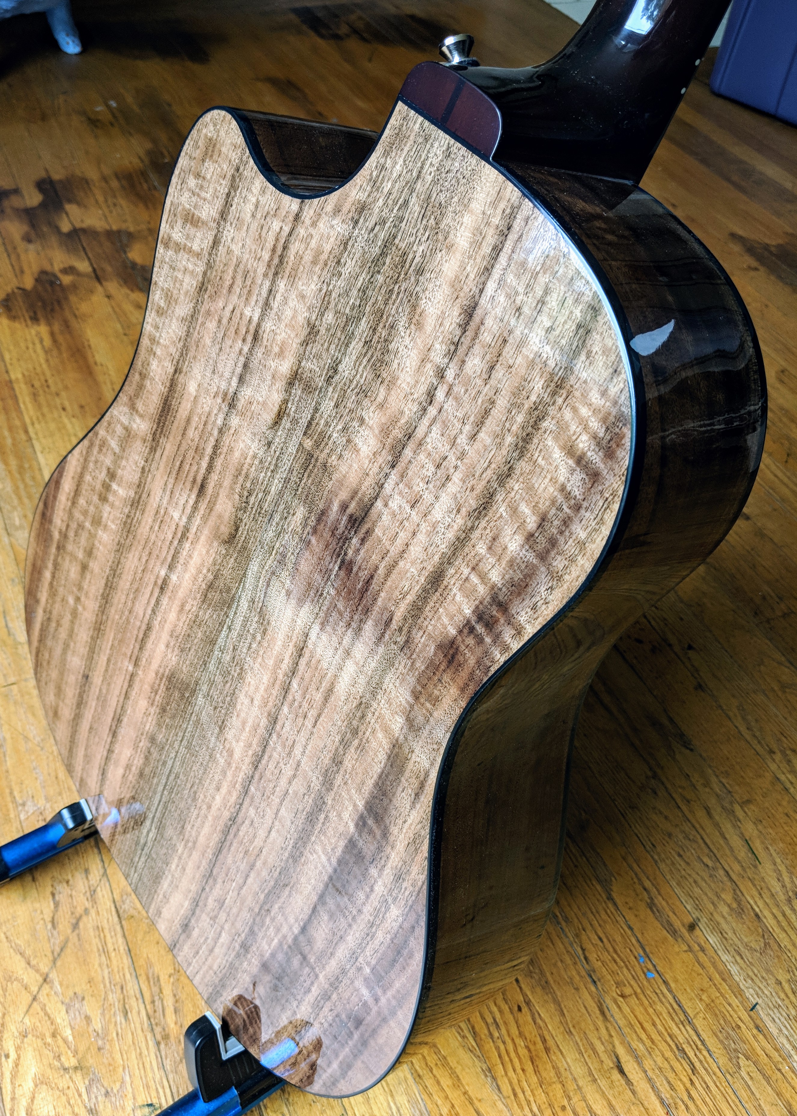 - First off, the guitar is absolutely gorgeous. The grain of the walnut is purely amazing. When I first looked at the back, I had to check myself. I haven’t seen a guitar back that looked like this except for a friend’s sapele acoustic (though sapele’s lines are more even). The striations on this walnut back and sides are incredible! It looks like a piece of frickin’ furniture!