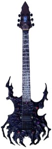 The guitar shown here is called the Arachnoid 1. When you take a close look at it, it really looks like a spider. In fact, the first impression I got was Gene Simmons meets the Lord of the Rings. Here’s an excerpt of the press release copy: