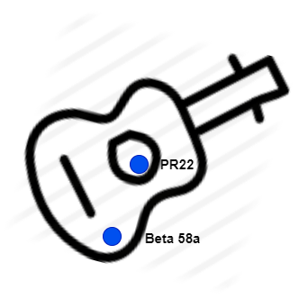 As far as distance is concerned, the PR22 is about 6″ from sound hole, while the Beta 58a is about 2″. Both are pointed directly at the guitar.