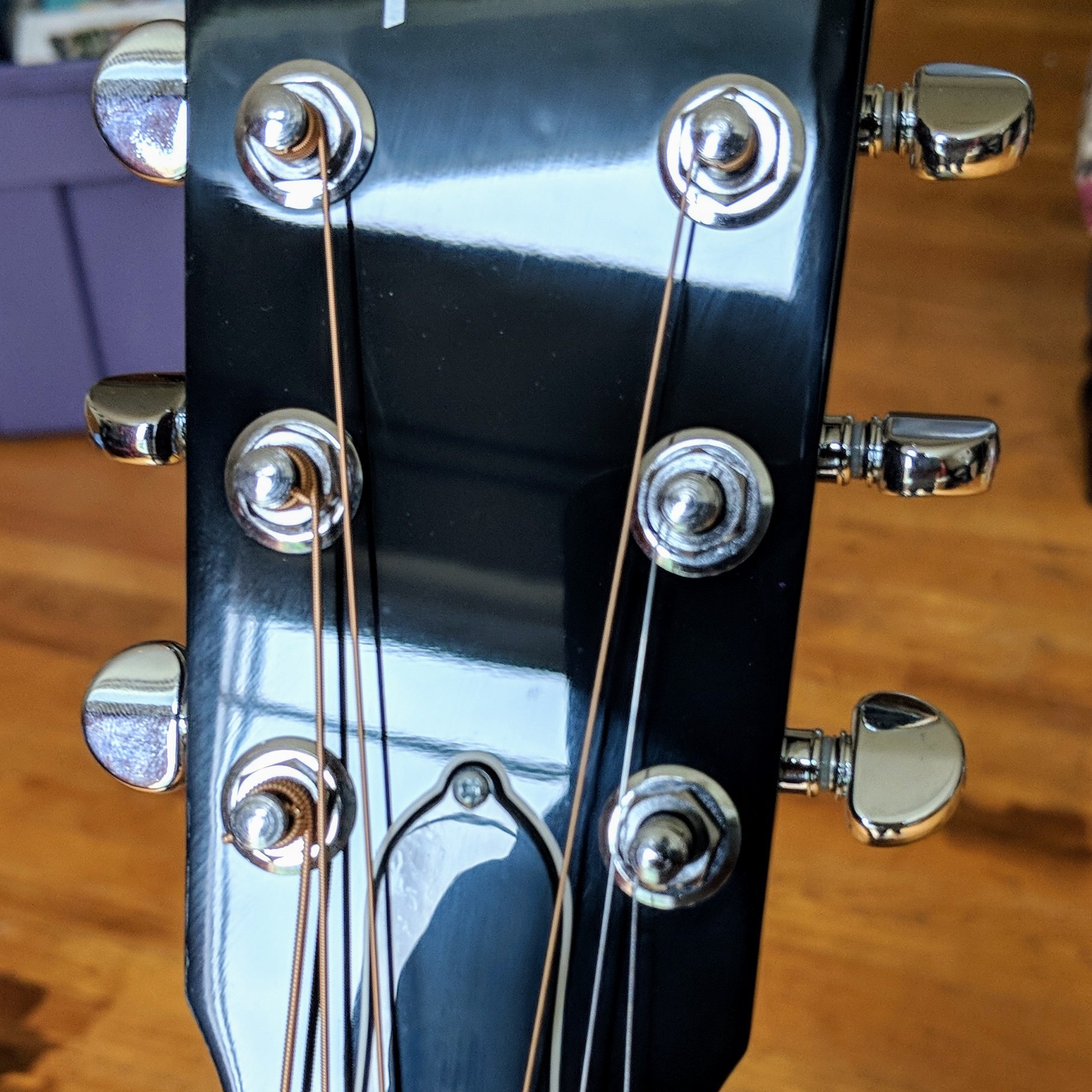 I had to back off the mic for the percussive strumming, so it turned out a little thin on the recording. But in a live situation, this guitar is LOUD! I played it at church over the weekend, and in that volume challenging environment, when I was really strumming hard, I could barely hear my amp! That’s how well the guitar projects. How naturally loud it is is a bit mind-blowing.