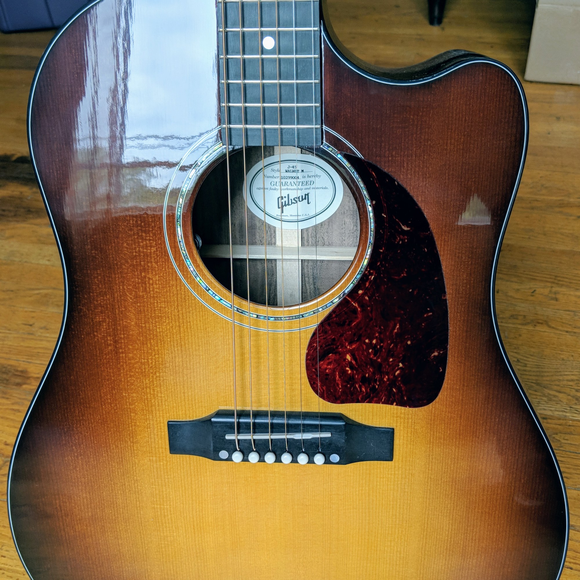 So to address the purists, no, it’s not a traditional J-45. It has a cutaway. The body is made of walnut, not rosewood. The fretboard is Richlite (which feels like ebony). The nut is Tusq, not bone. I DON’T CARE. This is a great guitar regardless of its build materials. Others have brought up that it couldn’t really be a J-45, but I beg to differ. It has the same profile as the J-45. But more importantly, all the tonal balance that I expect out of the J-45 is there, and how it sounds is incredible!