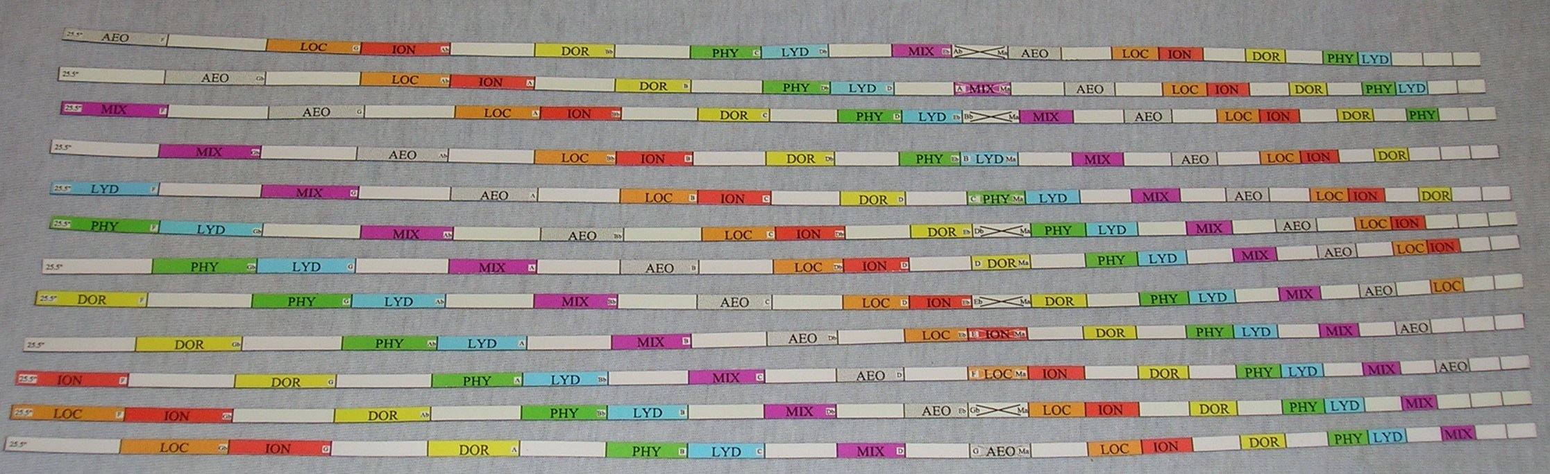 To attach magnets to the side of your fretboard, Jason provides step-by-step instructions. But you don’t even need the instructions. The base strip, of course, has no markings on it, so it’s easy figure out that it’s the base. It also has a weak adhesive that’s tacky enough to stick to your fretboard, and stay in place as you play, but not strong enough that it’ll peel your varnish. Once you have it in place, it’s just a simple matter of finding the key you want to practice, and laying it on top of the base strip. Each key is color-coded to show you the starting points for each mode. Click on the picture above to see an enlarged version of what they look like.